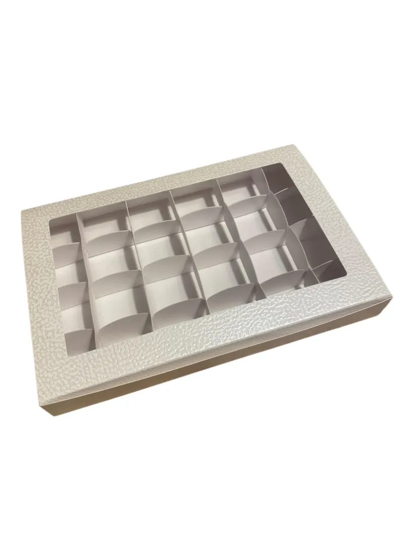 Fehér kartonból és átlátszó PVCből álló doboz, mely kiválóan alkalmas adventi naptárnak, mely apró kis meglepetéseket rejt. Oldalról nyitható, így kényelmesen hozzá lehet férni a benne levő termékhez. A dobozban az elválasztókkal 24 kis hely lesz. Ezek kb. 3,8*3,8 cm nagyságúak.